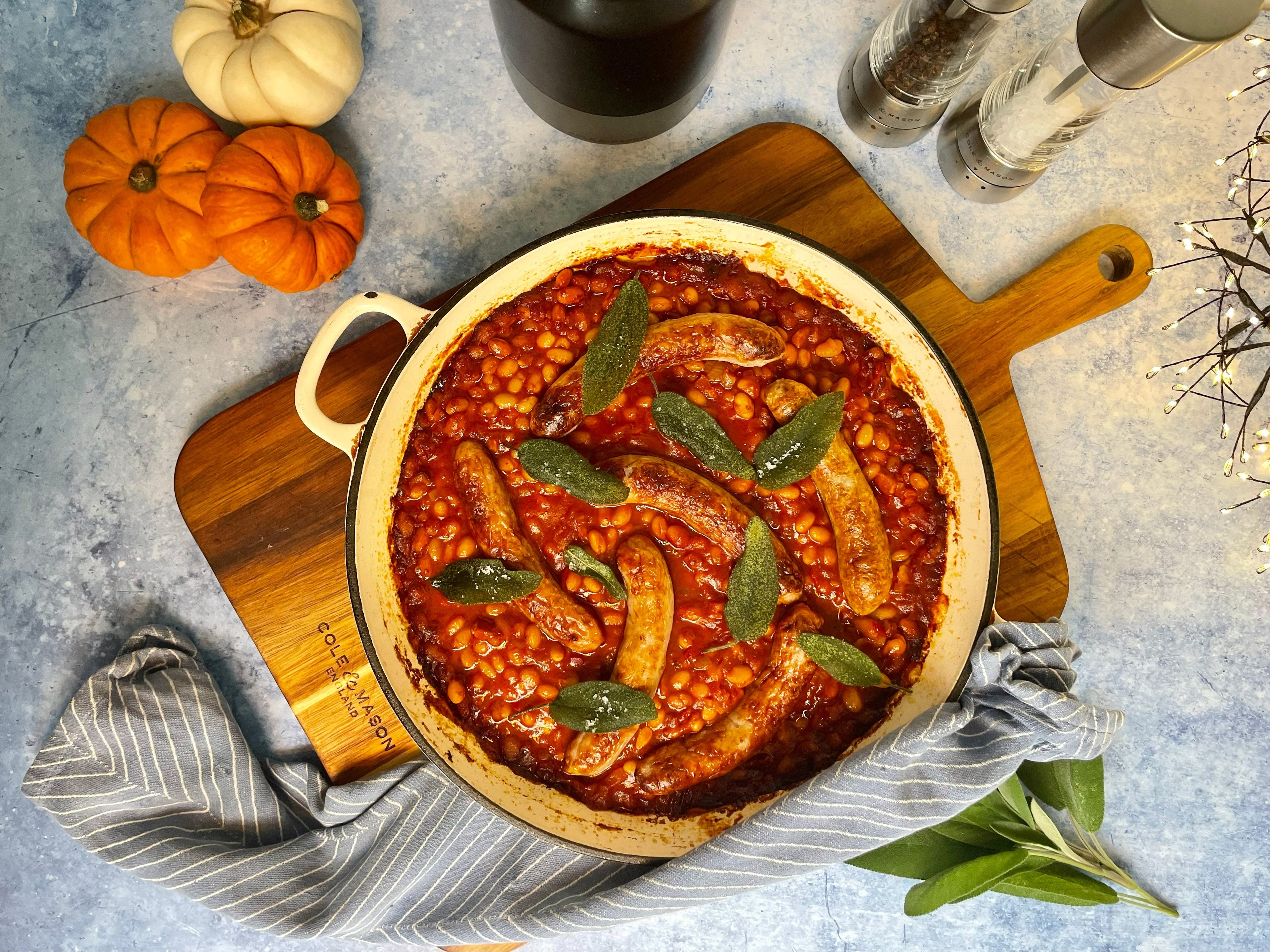 Serve any leftovers as a brunch dish with a crispy fried egg and toast to mop up the sauce. Seasoned perfectly with Cole & Mason Derwent Salt & Pepper Mills - the adjustable grind is perfect for different elements of the dish – finer grinding for the bean stew and then a little courser to get some little crystals of salt on the crispy sage leaves.