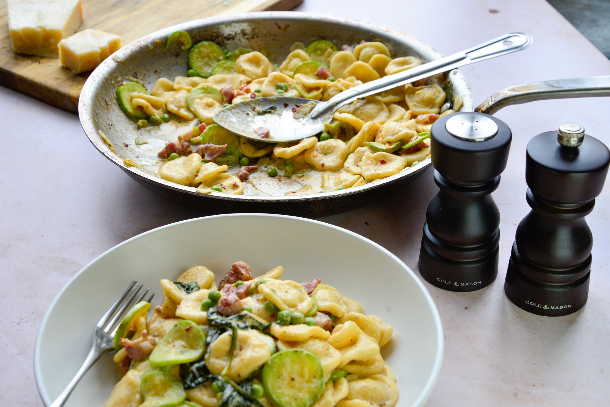 It’s the kind of dish that rewards slowing down: from the meditative shaping of the pasta to the gentle sizzle of the garlic in bacon fat. Seasoned with freshly cracked pepper and a shake of salt from the Cole and Mason salt shaker and pepper mill and finished with a hint of chilli warmth (if you're so inclined), it brings together the best of British summer garden flavours with comforting depth.