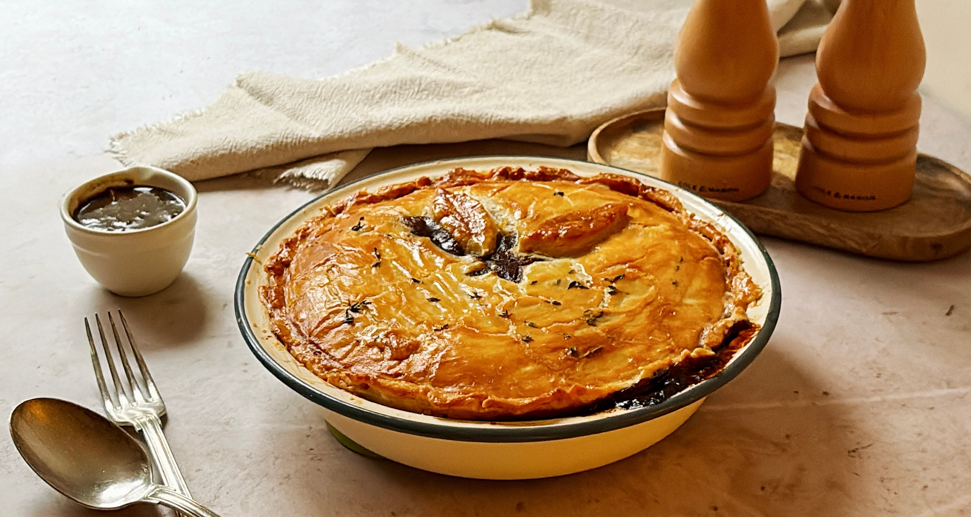 - Bake in a preheated oven at 180°C/Gas Mark 4 for about 50 minutes or until the pie looks golden and crispy. Serve with the remaining gravy reheated and your choice of seasonal sides.