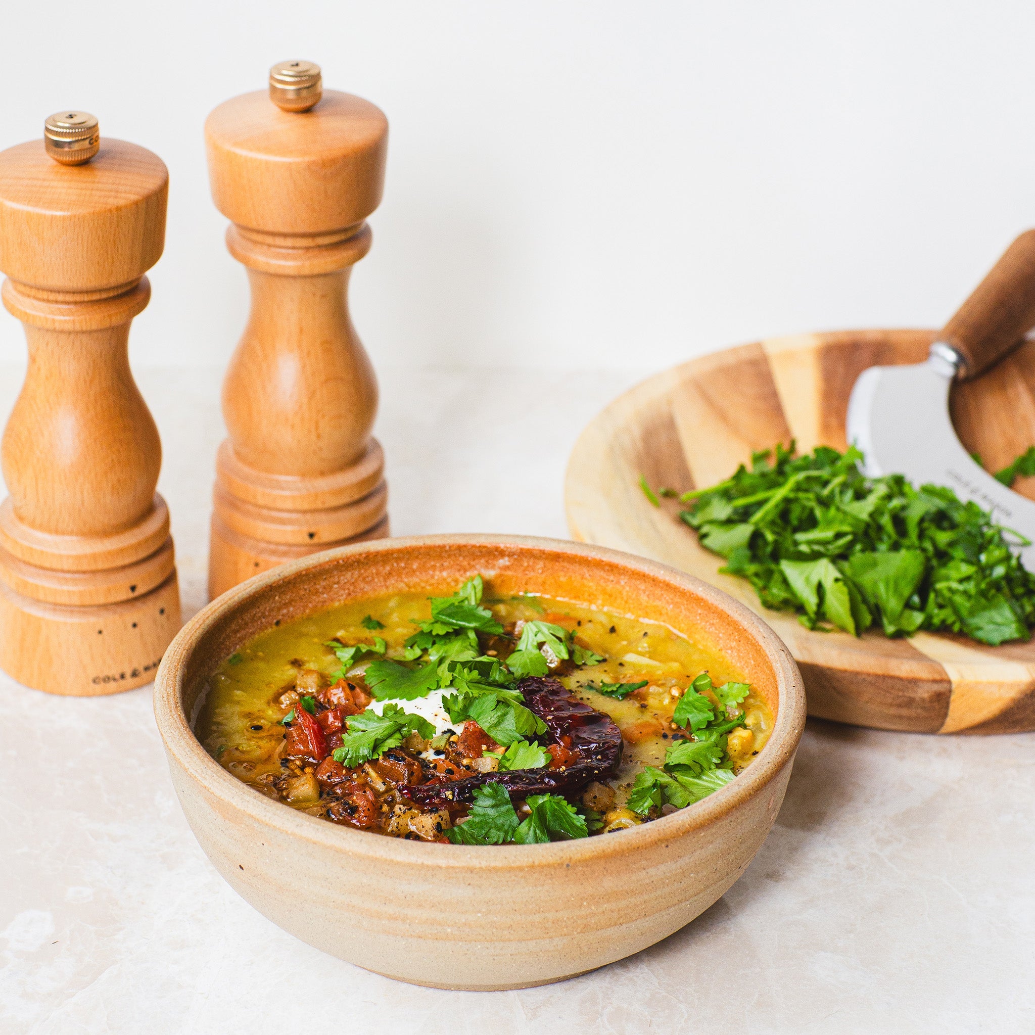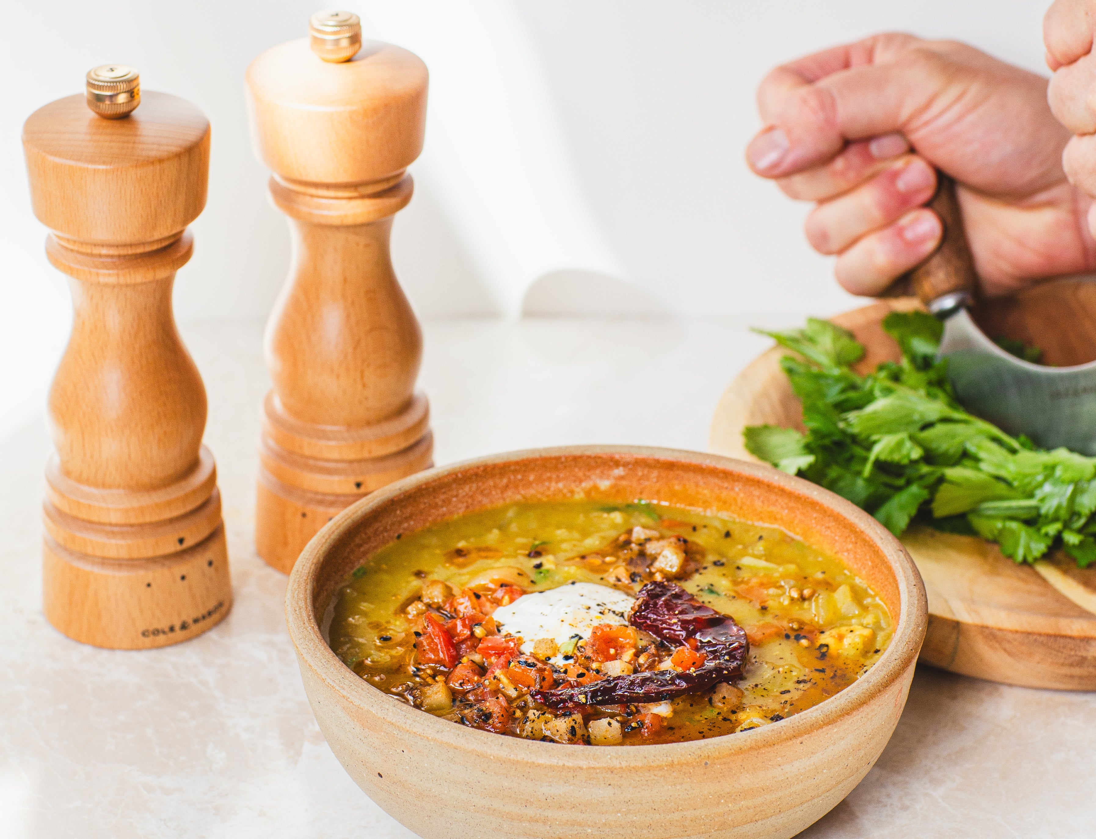 - Pour la garniture facultative, faites chauffer le ghee ou le beurre dans une poêle. Une fois chaud, ajoutez le mélange d'épices entières, les piments entiers et les tomates coupées en dés, ainsi qu'une généreuse quantité de sel et de poivre noir. Dès que le mélange frémit et mousse, et embaume la pièce, versez-le sur la soupe, ajoutez une cuillerée de yaourt et quelques feuilles de coriandre fraîche.